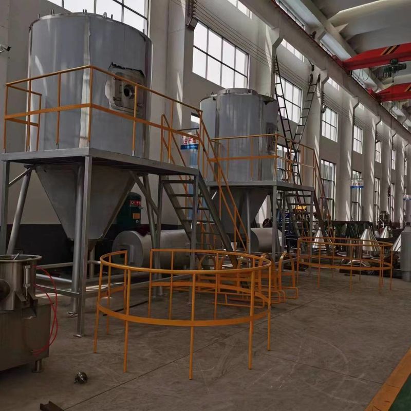 Après filtrage et chauffage, l'air entre dans le distributeur d'air sur le matériel de séchage. L'air chaud entre dans la forme de spirale de tour de séchage et uniformément. Par .passing par l'atomiseur centrifuge ultra-rapide sur la tour, le liquide matériel tournera et sera pulvérisé dans les perles liquides de brume extrêmement fine. Par la courte durée même d'entrer en contact avec de l'air de chauffage, le matériel peut être séché dans des produits finis. Les produits finis seront déchargés sans interruption du fond de la tour de séchage et du séparateur cyclonique.
